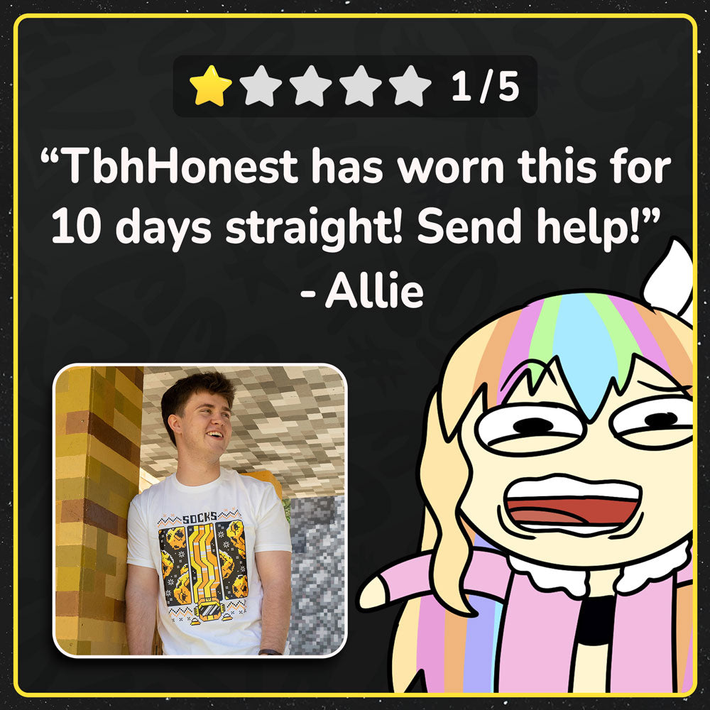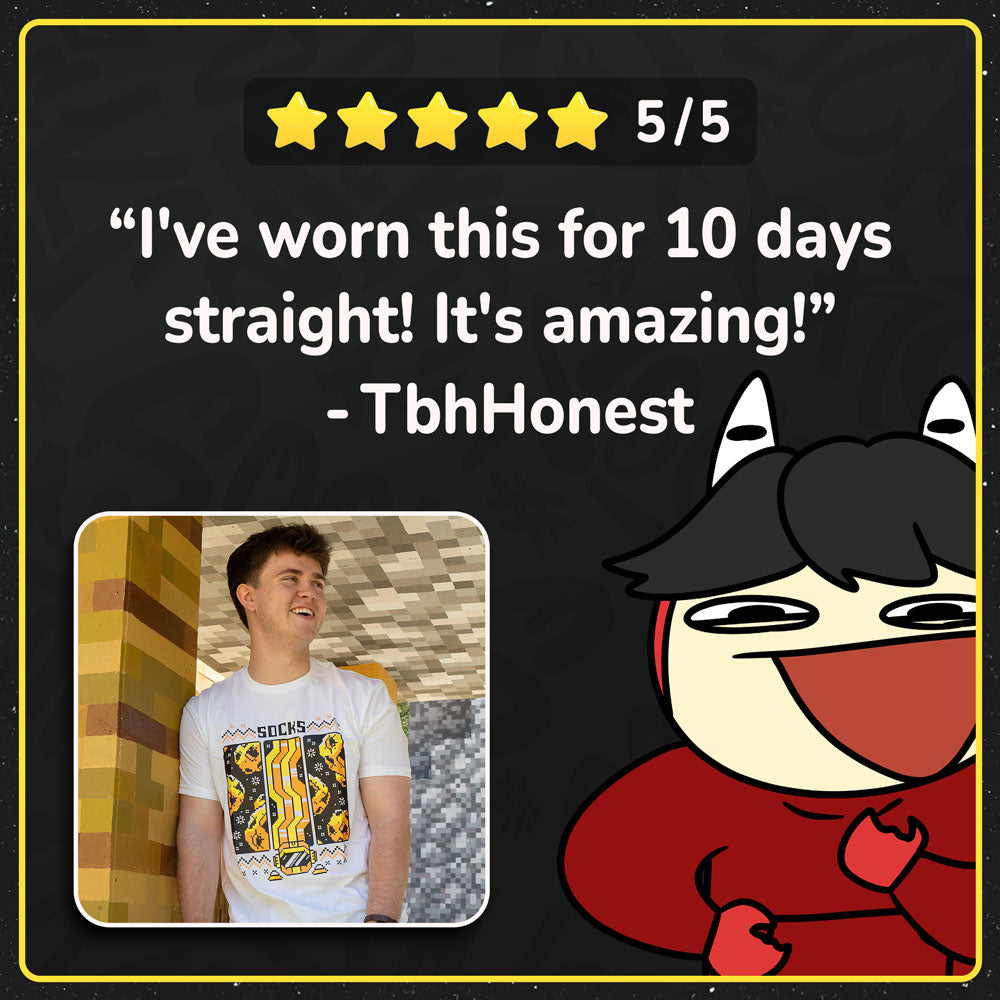 Make some space in your closet (bad pun intended) for the launch (that one too) of the Socks 8-bit Space Shirt! This comfortable 100% cotton shirt, with this durable 3-color design, will bring back the nostalgia for the good ol' days.