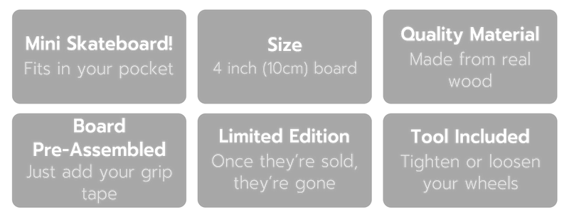 Socks Shreds, the limited edition collectible fingerboards! The Socks Shreds fingerboards are mini-versions of skateboards that you can ride around with just your fingers. Each board is pre-assembled with trucks and wheels, and everything you need to skate it up straight out of the package! Whether you're a collector, want to use your bath tub as a skate park, or get unnecessarily good at a hobby in an attempt to impress literally anyone, this is the perfect toy for you! This is our Season 1 release, so each board is limited edition, and once we sell them, they are never coming back! Have fun, and Shred on!